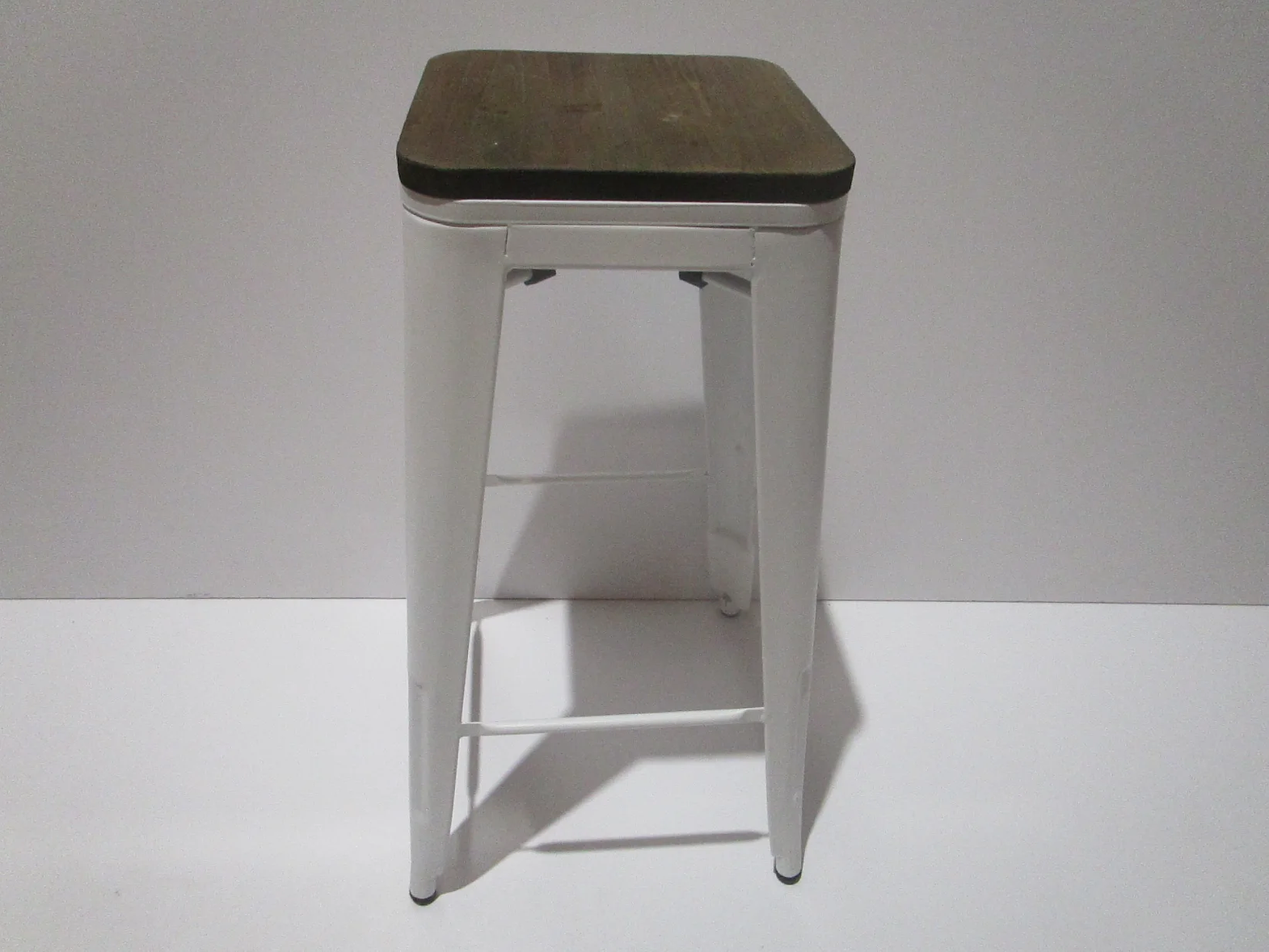 Add a touch of modern farmhouse and industrial style to your dining or kitchen area with this exceptionally sturdy bar stool. The foundation features a solid matte white metal construction, ensuring long-lasting stability and a clean, contemporary aesthetic that brightens any space. Complementing the base is a natural wood seat that introduces warmth and texture, making the stool comfortable and visually appealing. The thoughtful design includes integrated cross-bracing for foot support and enhanced stability. With approximate dimensions of 42.5 cm x 42.5 cm and an impressive height of 77 cm, this piece is ideally proportioned for standard bar counters. It is a fantastic seating choice for breakfast bars, game rooms, or commercial settings.