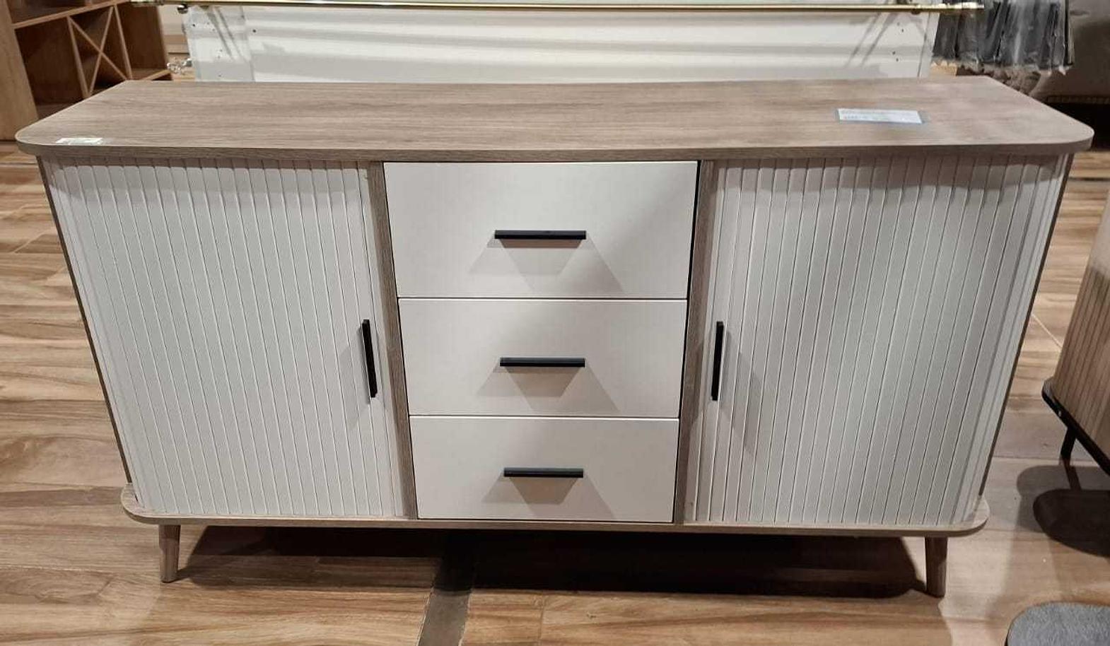 This stylish buffet combines bright modern design with warm natural texture: a white-front façade paired with a wood-finished structure. Measuring 140 cm in width, 40 cm in depth, and 76 cm in height, it provides ample storage space with two full-width doors (ideal for dishes, glassware, or board games) and three drawers (for cutlery, linens, or accessories). The clean white front keeps the piece looking fresh and contemporary, while the wood body adds character and warmth