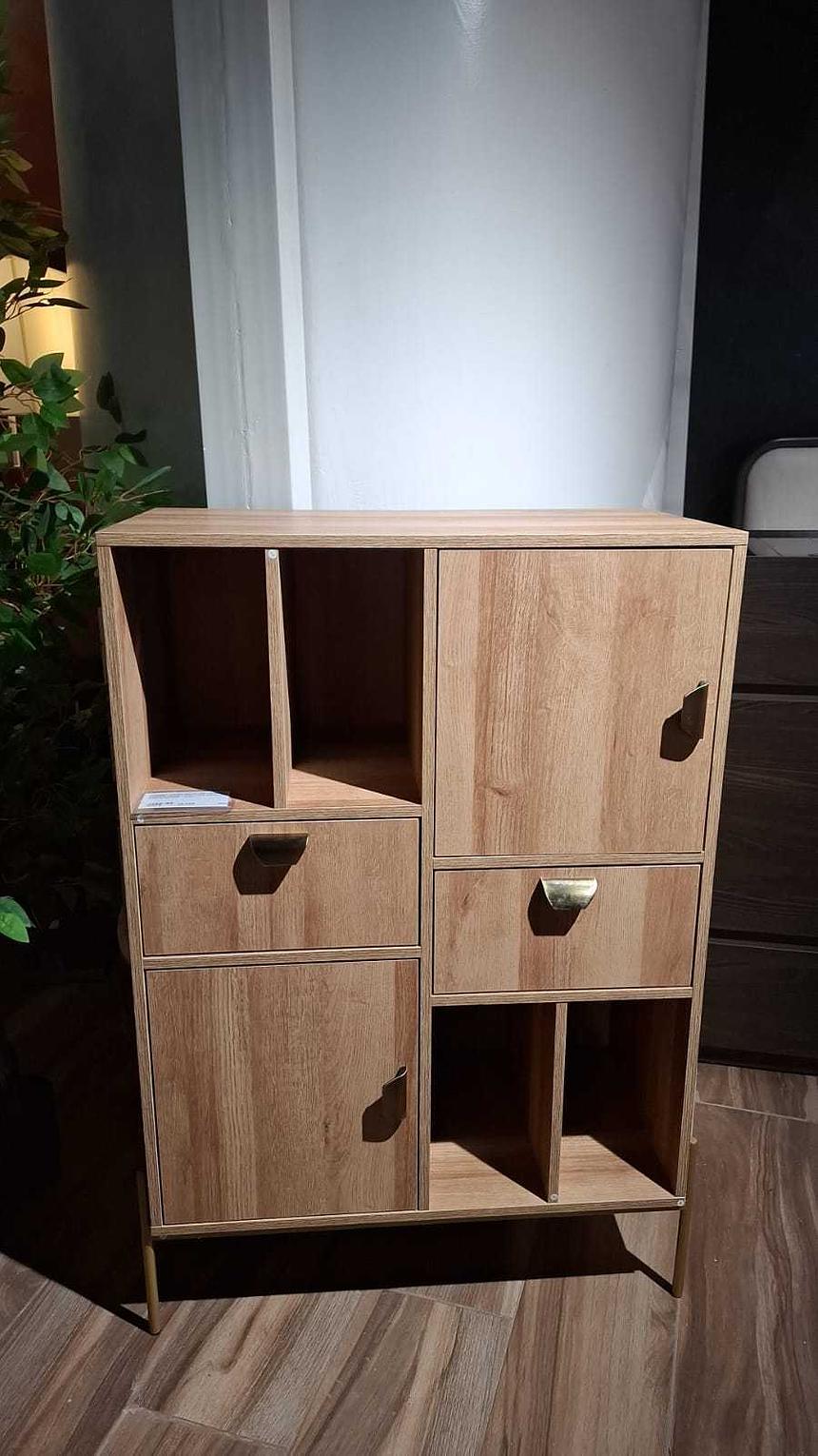 This elegant cabinet combines warm wood tones with refined antique bronze hardware and legs for a sophisticated look. Measuring 80 cm wide, 40 cm deep and 115 cm high, it offers a vertical storage solution ideal for living areas