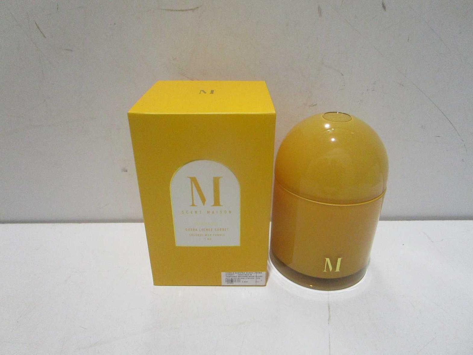 Candle scented guava lychee sorbet - 1000g wax in tempered machine made glass pot with lid and 3 wicks - 10% fragrance - packaging in coloured card board box 400g orange #ref:mar1000gu# 4ac#