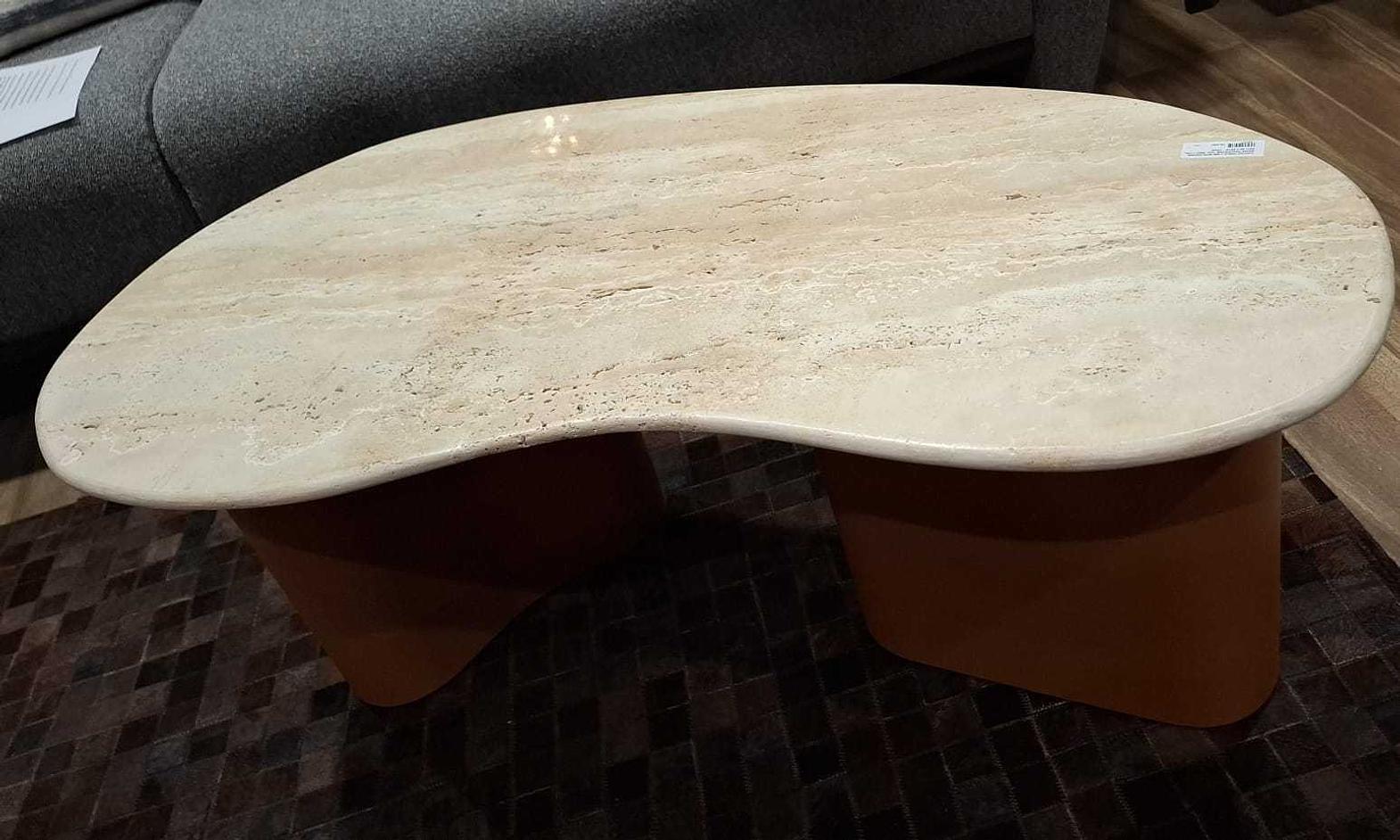 Modern coffee table featuring a sturdy 2mm iron drum base paired with an elegant beige travertine stone top. A refined blend of industrial strength and natural luxury, perfect for contemporary and upscale living spaces.