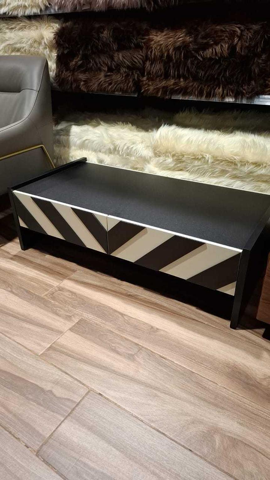 A contemporary coffee table featuring a black melamine body with sleek black-and-white MDF doors. Designed for modern interiors that value both style and storage.