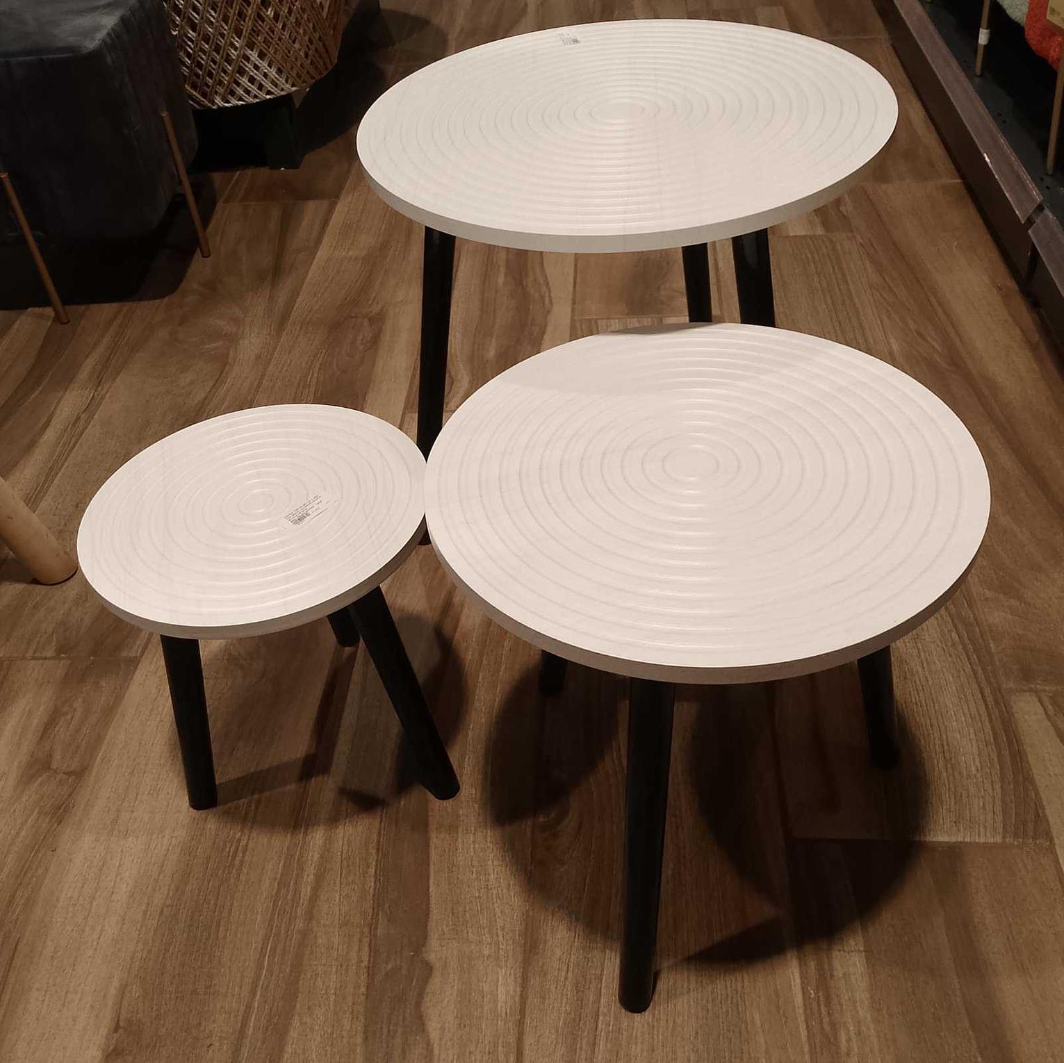 Set of three white coffee tables with MDF tops and wooden legs in varying sizes for a clean, modern look.