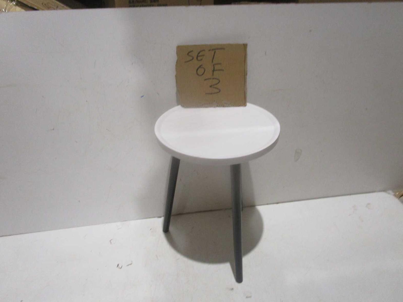 Set of three coffee tables with white MDF tops and wooden legs in three practical sizes for modern living spaces.