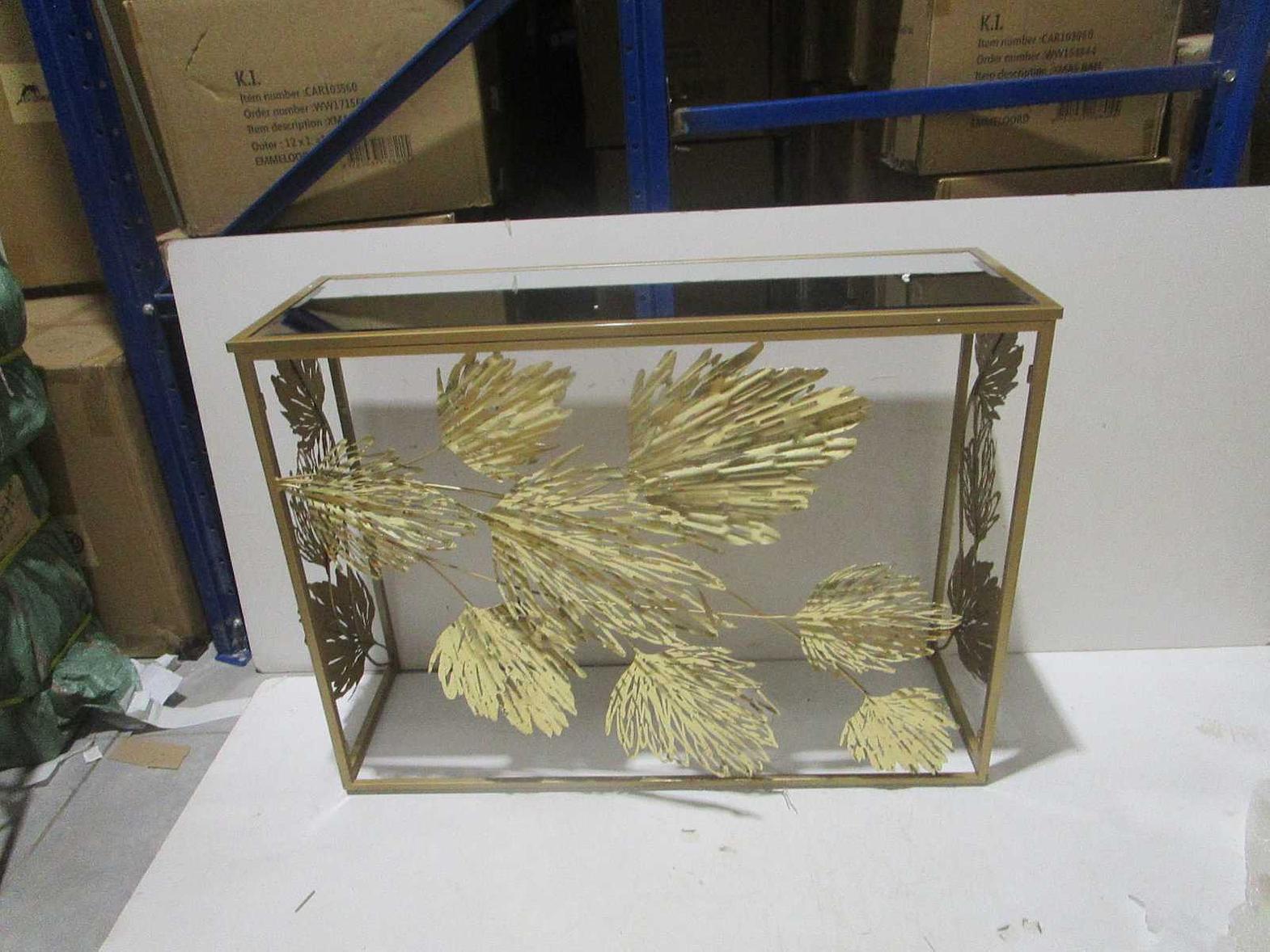 The Console Table combines a sleek mirrored tabletop with a sturdy gold-finished metal base, creating a refined and modern accent piece for contemporary interiors. Measuring 111.8 × 39.4 × 79.4 cm, it offers a slim profile ideal for entryways, living rooms, or hall spaces.