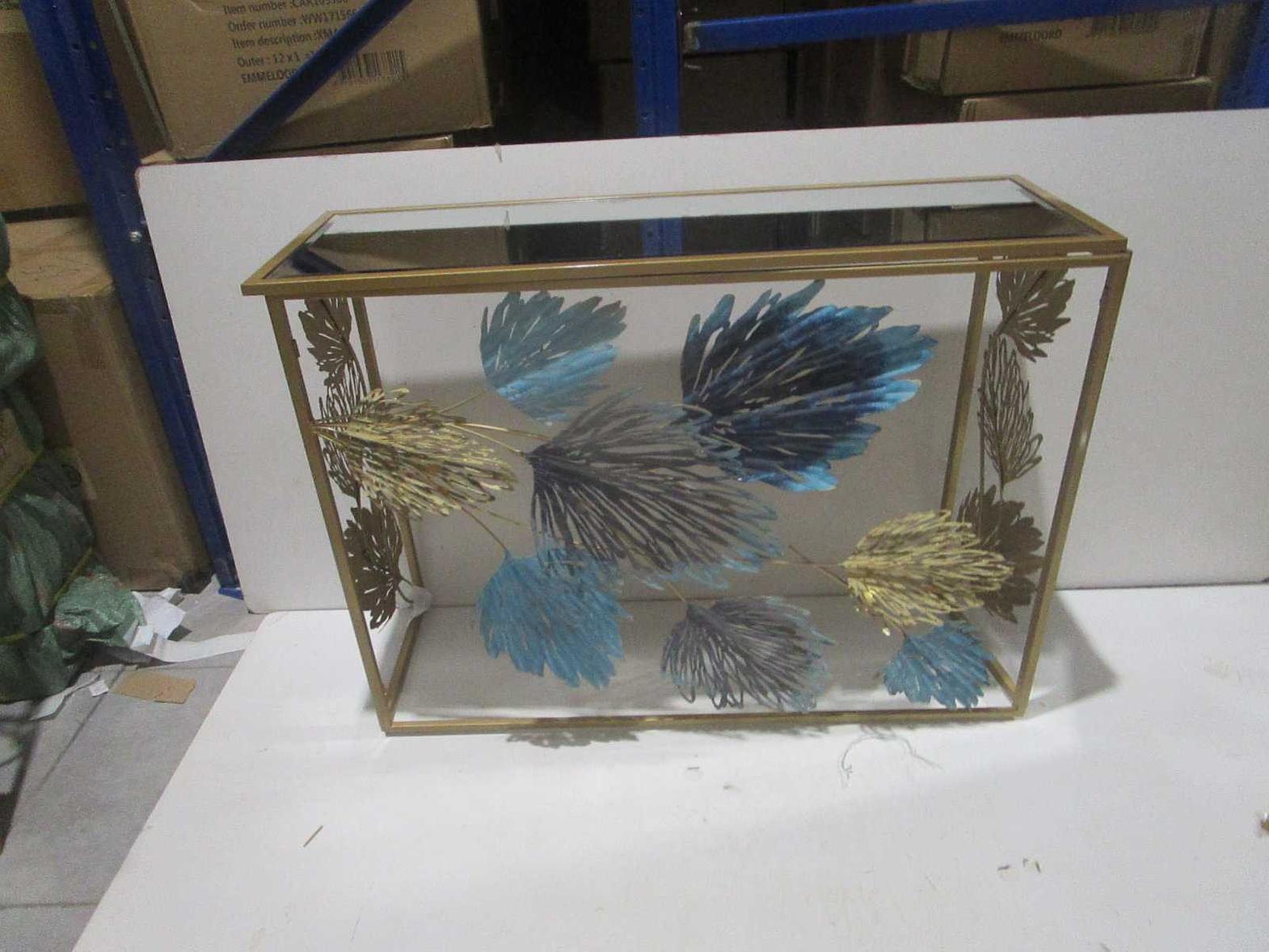 The Console Table showcases a mirror-top surface paired with a gold-finished metal frame accented by a decorative blue leaf motif, creating an elegant fusion of art and function. With dimensions of 111.8 × 39.4 × 79.4 cm, it’s ideally sized for hallways, living rooms, or entry spaces.