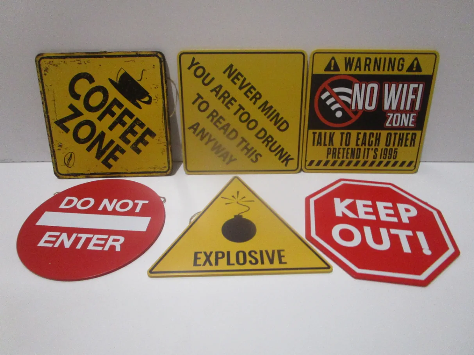 Elevate your interior decor with this exciting set of six decorative metal plates, each offering a distinct, eye-catching design reminiscent of classic signage. The collection includes various shapes and vibrant color schemes, from the "Coffee Zone" square to the "Keep Out!" octagon and a fun "No WiFi Zone" warning. These plates are expertly crafted for a distressed, vintage look, adding character and warmth to any space. Made from high-quality, long-lasting metal, they are robust and designed for effortless wall mounting, making customization quick and simple. Transform your living space or gifting a memorable piece of decorative art that sparks conversation and amusement.