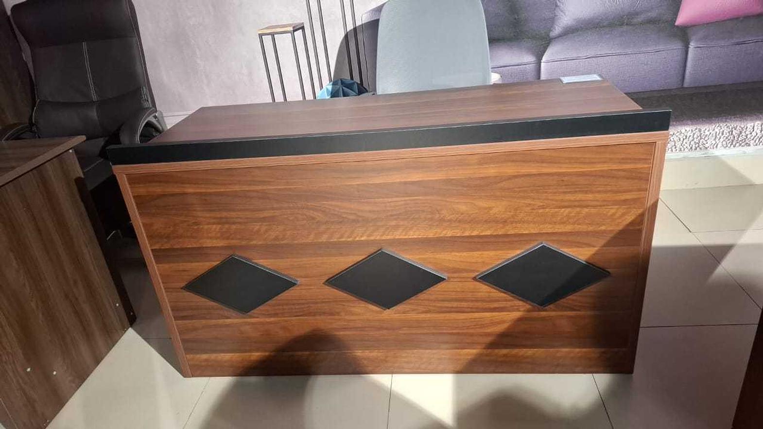 The Desk Podium is a sleek and durable workstation designed with a combination of King Walnut MFC (Melamine Faced Chipboard) and a sturdy black iron frame.