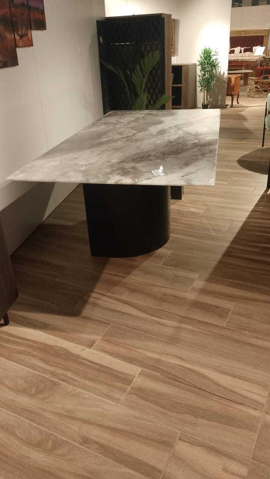 The Monolith Grand Dining Table serves as the ultimate centerpiece for large residential dining rooms or upscale corporate spaces, effortlessly combining grand scale with refined materials. The dominant feature is the expansive artificial marble tabletop, boasting a thick 15mm edge that provides a substantial, high-end look while offering superior resistance to stains and wear compared to natural stone. Supporting this impressive surface is a base system utilizing the strength of steel, framed by MDF for structure, and finished with a realistic wood paper veneer to introduce organic texture and warmth. With its generous dimensions of 2400mm by 1200mm, this table comfortably accommodates large gatherings, offering a premium, enduring focal point that elevates the experience of any meal or important meeting.