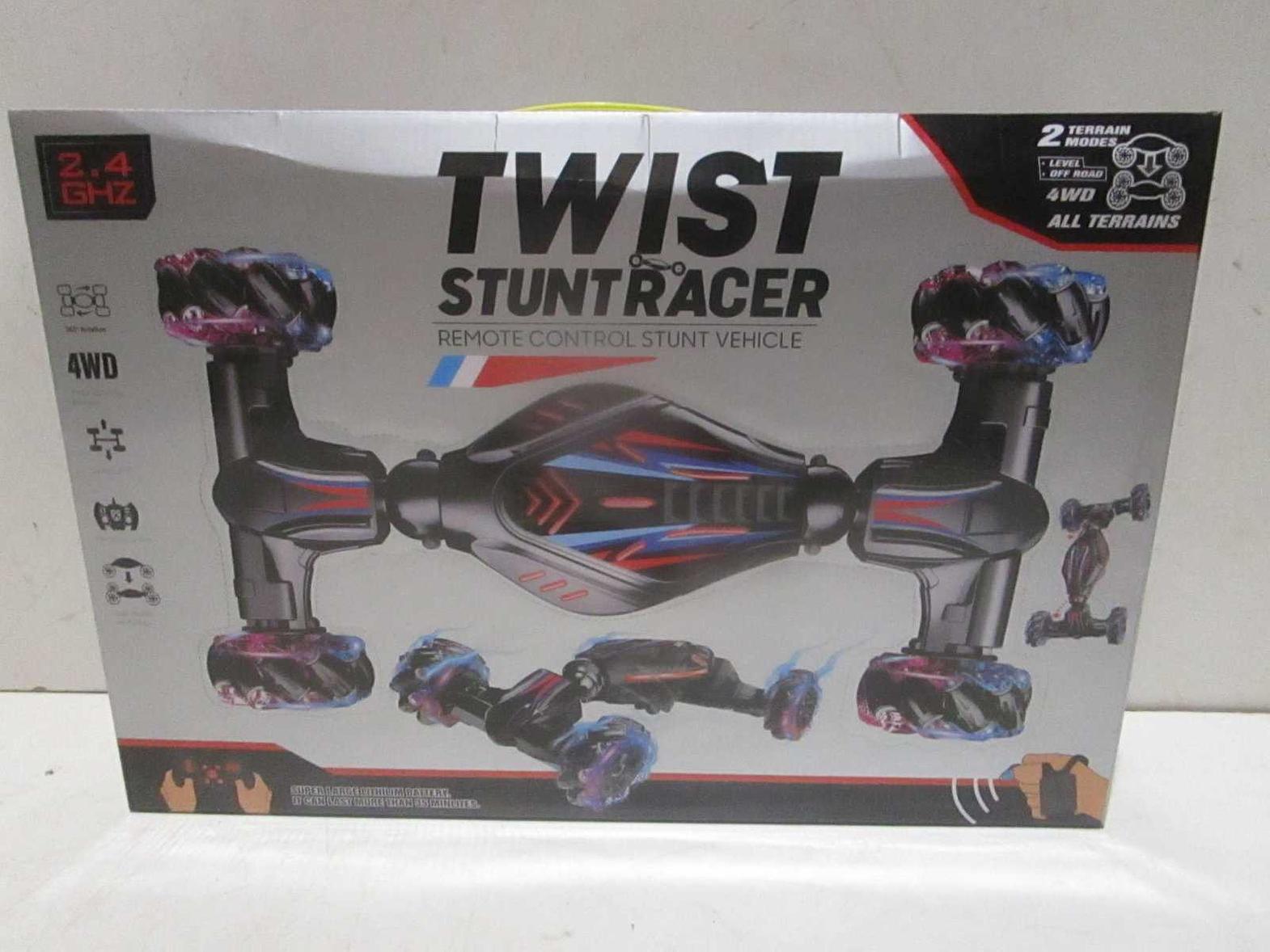 Set of 2 distortion remote control cars with lighting, USB rechargeable, in black packaging.