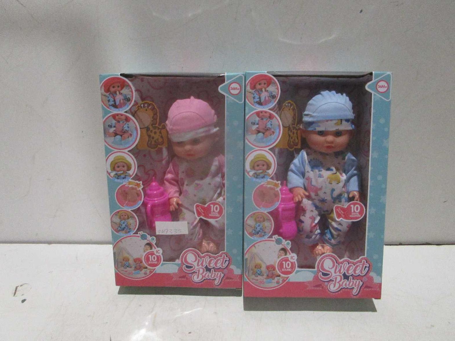 Set of 2 dolls with water drink, pee, and sound functions, available in pink and blue.