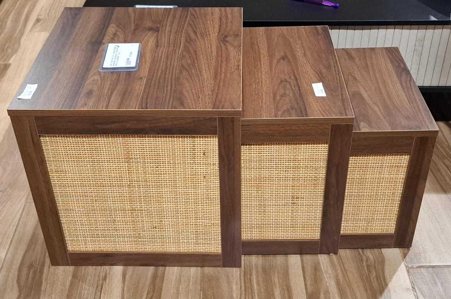 This stylish set of three wooden end tables offers both versatility and aesthetic unity. Finished in wood the tables come in three sizes: 45×45×45 cm, 40×40×40 cm, and 35×35×35 cm, allowing you to arrange them nested, side-by-side, or spread across your living space. Whether used as side tables next to a sofa, auxiliary surfaces beside a chair, or grouped to serve as a larger coffee-table alternative, the design adapts to your layout. The matching wood finish and clean proportions fit modern, Scandinavian, or transitional interiors—especially in homes where coordinated furniture collections matter. This set gives you flexible surface options while maintaining a cohesive material and finish aesthetic.