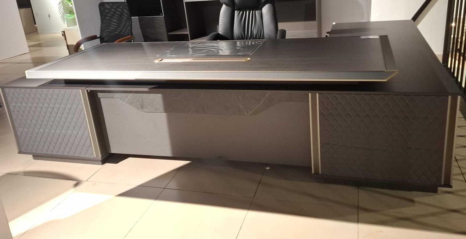 Premium executive desk featuring a sophisticated purple teak melamine finish. Designed for modern executive spaces, it offers an expansive work surface and integrated side extension for enhanced productivity and organization. Ideal for high-end offices demanding a blend of elegance, durability, and functionality.