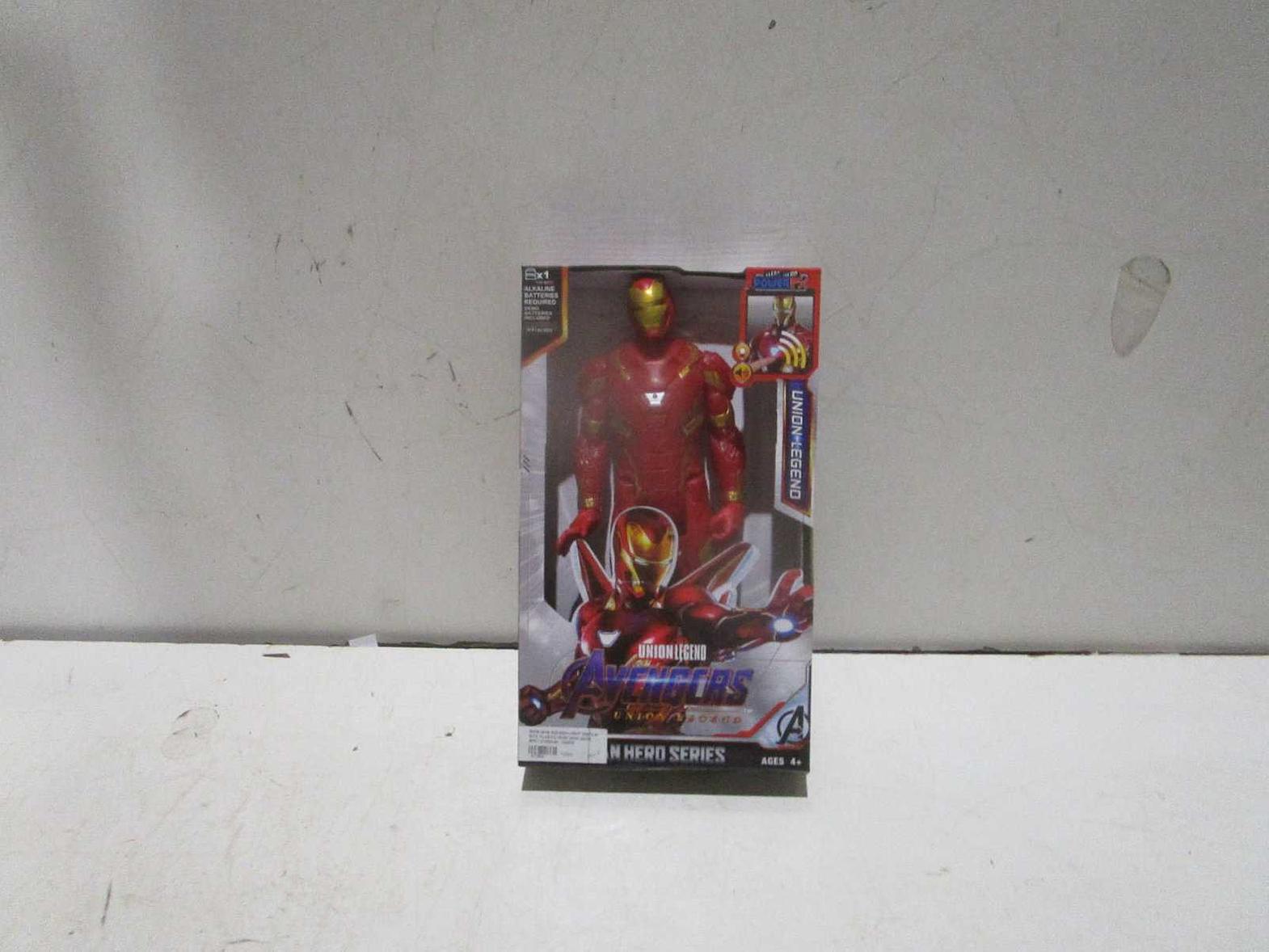 Iron Man action figure with sound and light effects, 30 cm tall, display box.