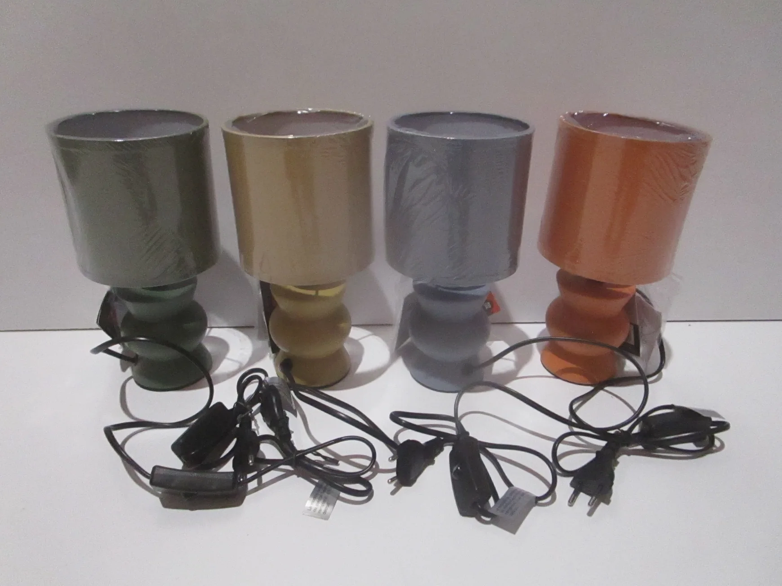 Brighten up your home with this delightful collection of small accent lamps, designed to bring both form and function to bedside tables, desks, or shelves. Each lamp stands approximately 25 cm tall and features a beautifully contoured, sculpted base and a complementary fabric drum shade, creating a cohesive, modern aesthetic. The assortment includes four contemporary, muted tones: Sage, Blue Grey, Terracotta, and Sand, making it easy to integrate them into various color schemes and decor styles. These lamps provide a soft, ambient glow, perfect for reading or creating a cozy atmosphere in any room. Their compact size and easy-to-use in-line switch make them a practical and charming household addition.