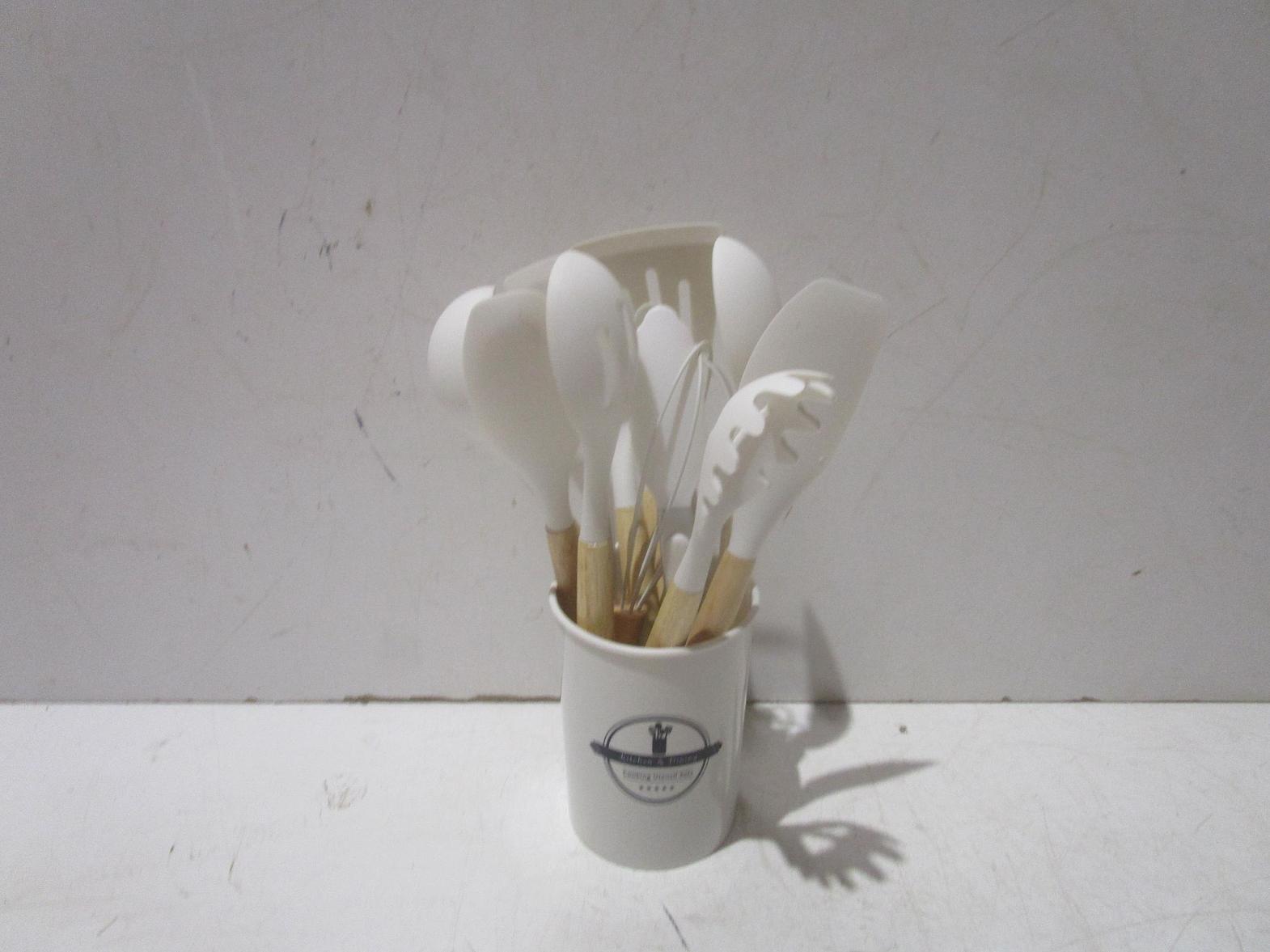 Moq:1000set utensils kitchen silikone x11 + bamboo wood handle + x1 plastic cup holder 706g tempreture : 30c-230c cup:14.5*9.5cm 114g soup spoon: 32cm 67g whisk: 24cm 28g scraper: 32cm 65cm skimmer : 32cm 60g noodle spoon: 32cm 46 #ref:7-36245-1-c# 16ac#
