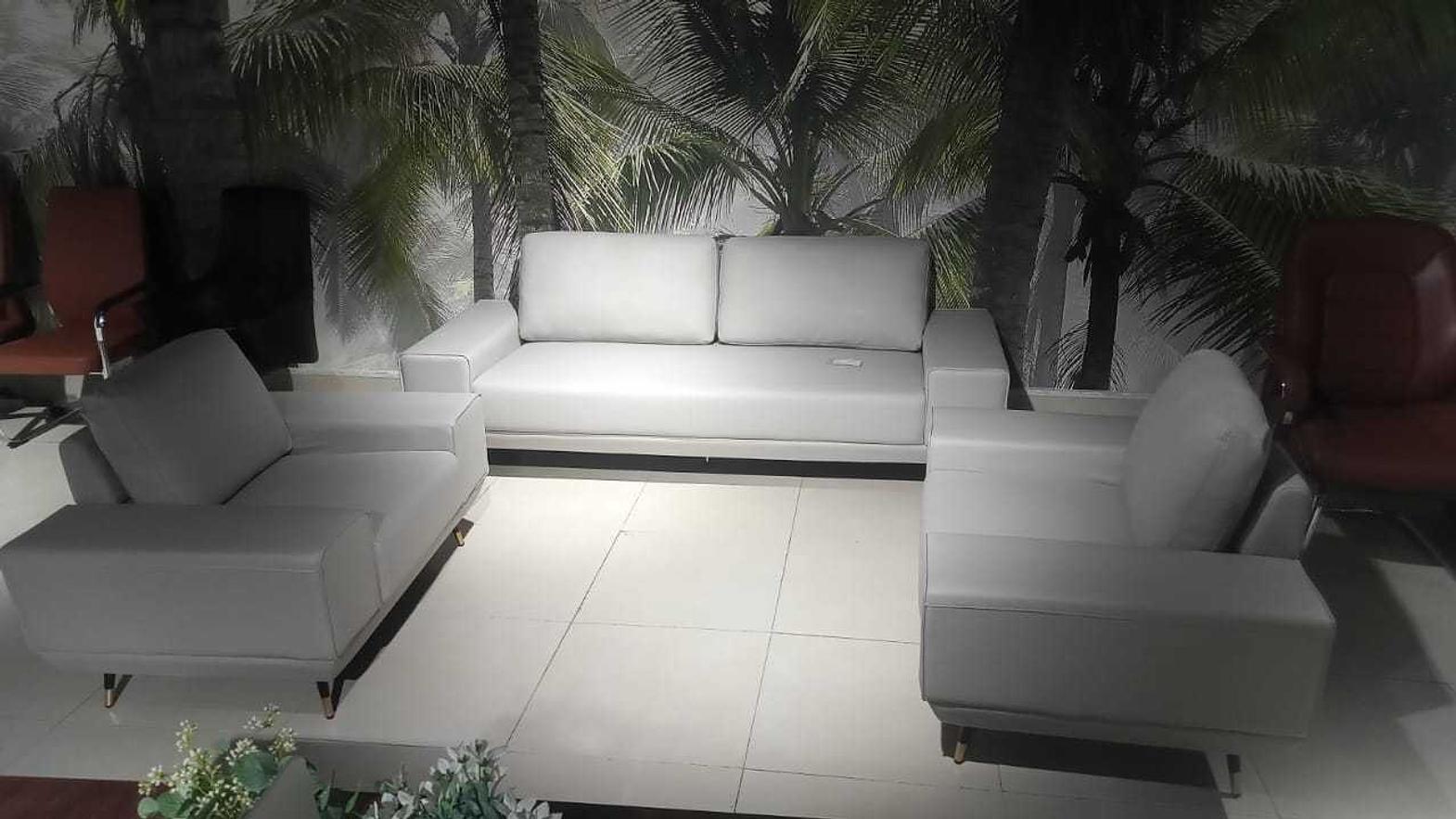 A modern office sofa set with a 3-seater and two single chairs in dark beige fabric. Ideal for stylish and comfortable office seating.