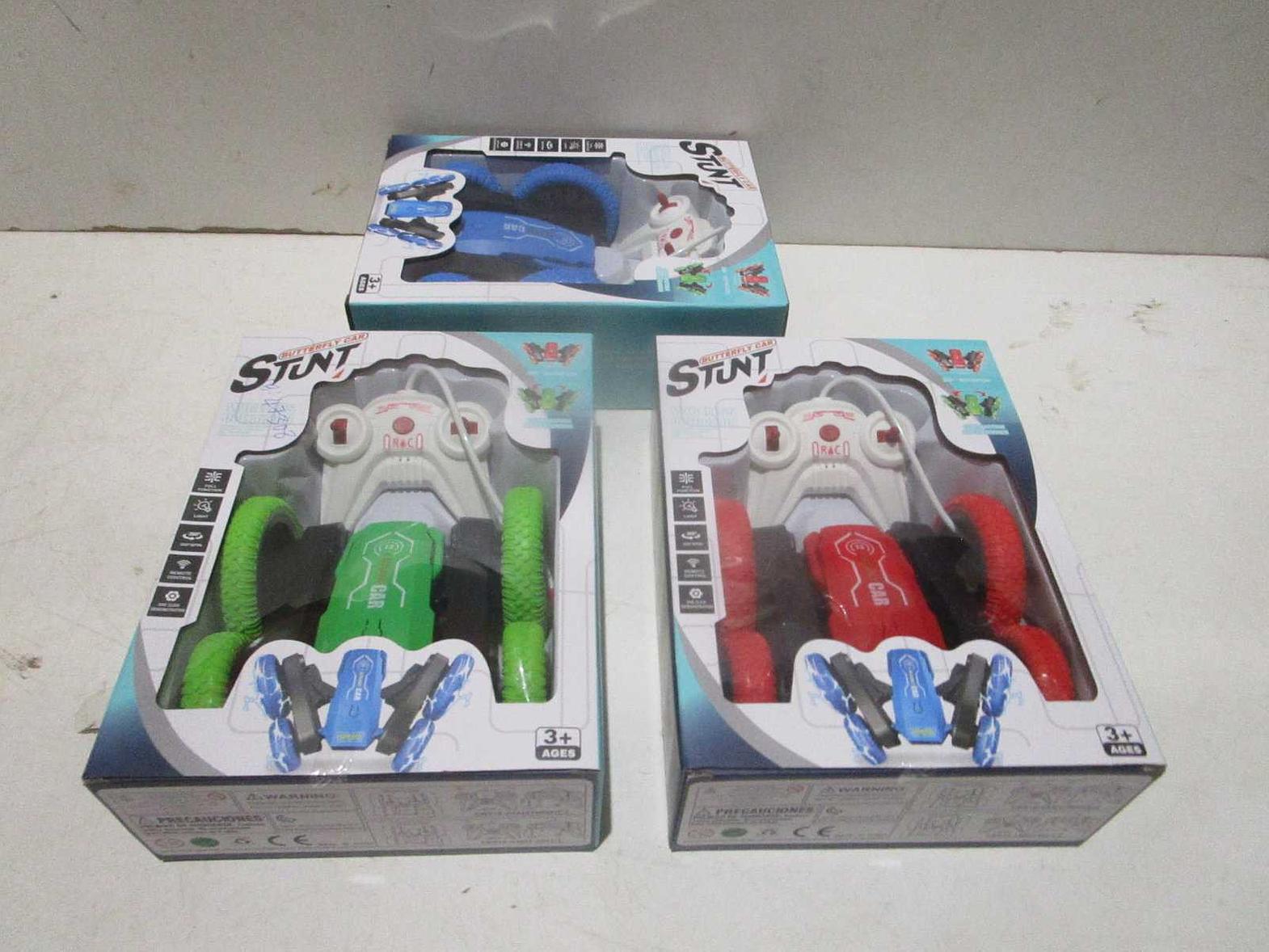 Remote control butterfly car with USB rechargeable battery, available in blue, green, and red.