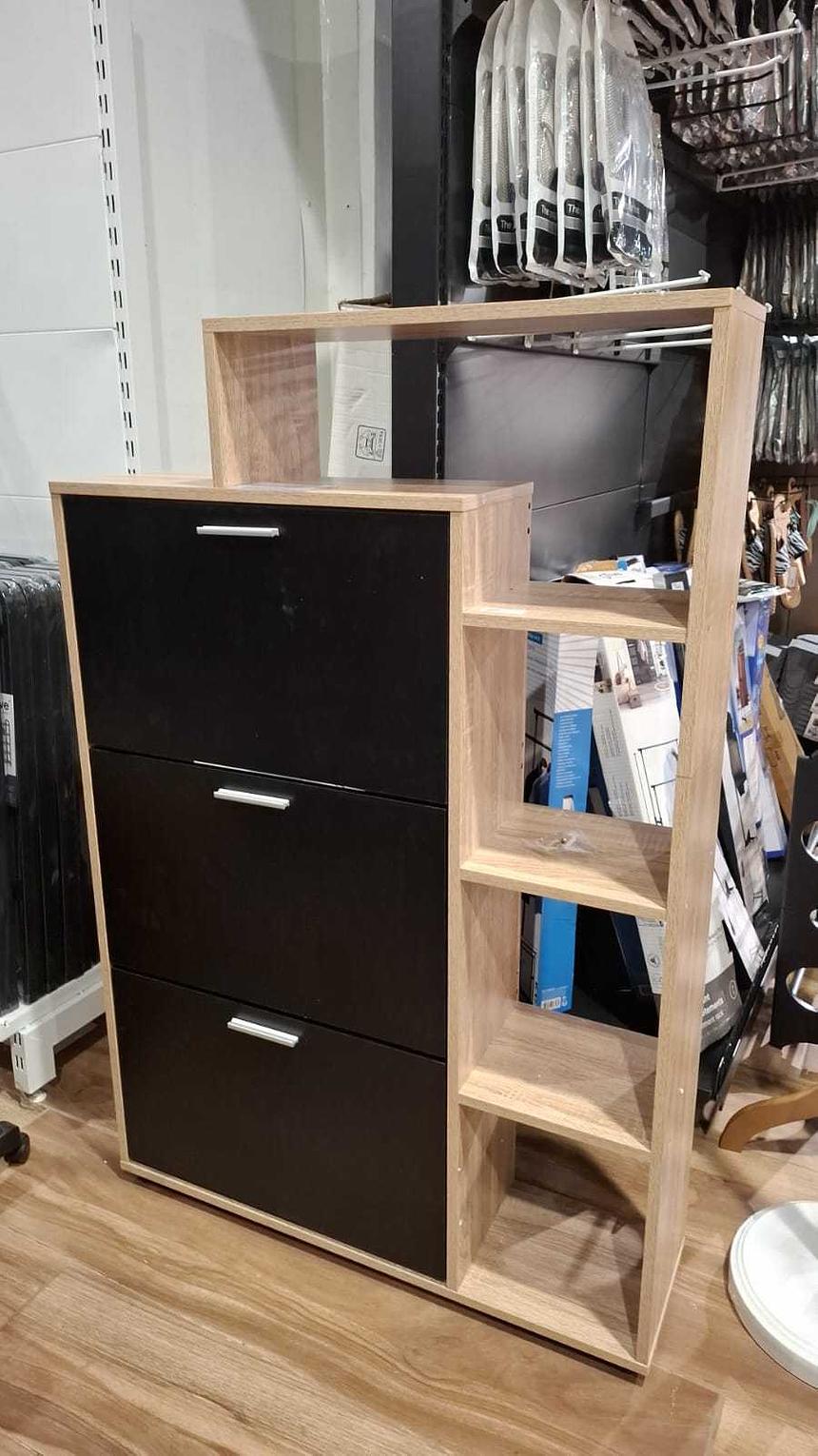 This stylish and practical shoe cabinet offers both storage and design. Measuring 86.5 cm wide, 23.5 cm deep and 132 cm high, it is ideal for entryways or hallways where space is limited but vertical storage is welcomed. The unit features three doors with a sleek black-finish façade contrasted by wood framing combining bold and warm elements. Inside, shelves are arranged to hold approximately 18 pairs of shoes, making it well-suited for a family setting or for shoe-enthusiasts who value organisation. This cabinet’s design fits modern, Scandinavian or transitional interiors, adding functionality without sacrificing style.