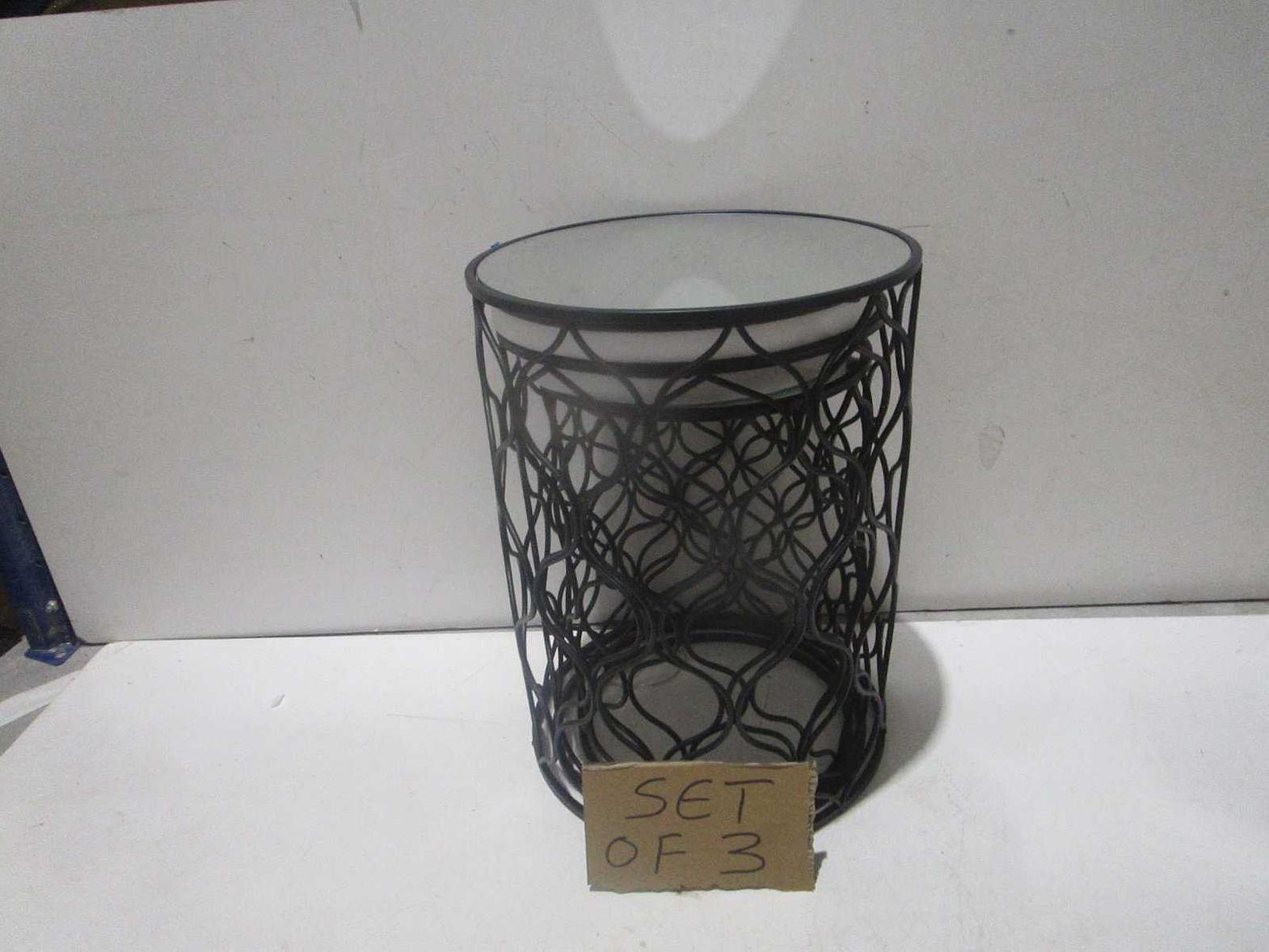 The Side Table Set includes three nesting tables in black metal frames topped with elegant mirror surfaces, offering a modern, versatile solution for living spaces.