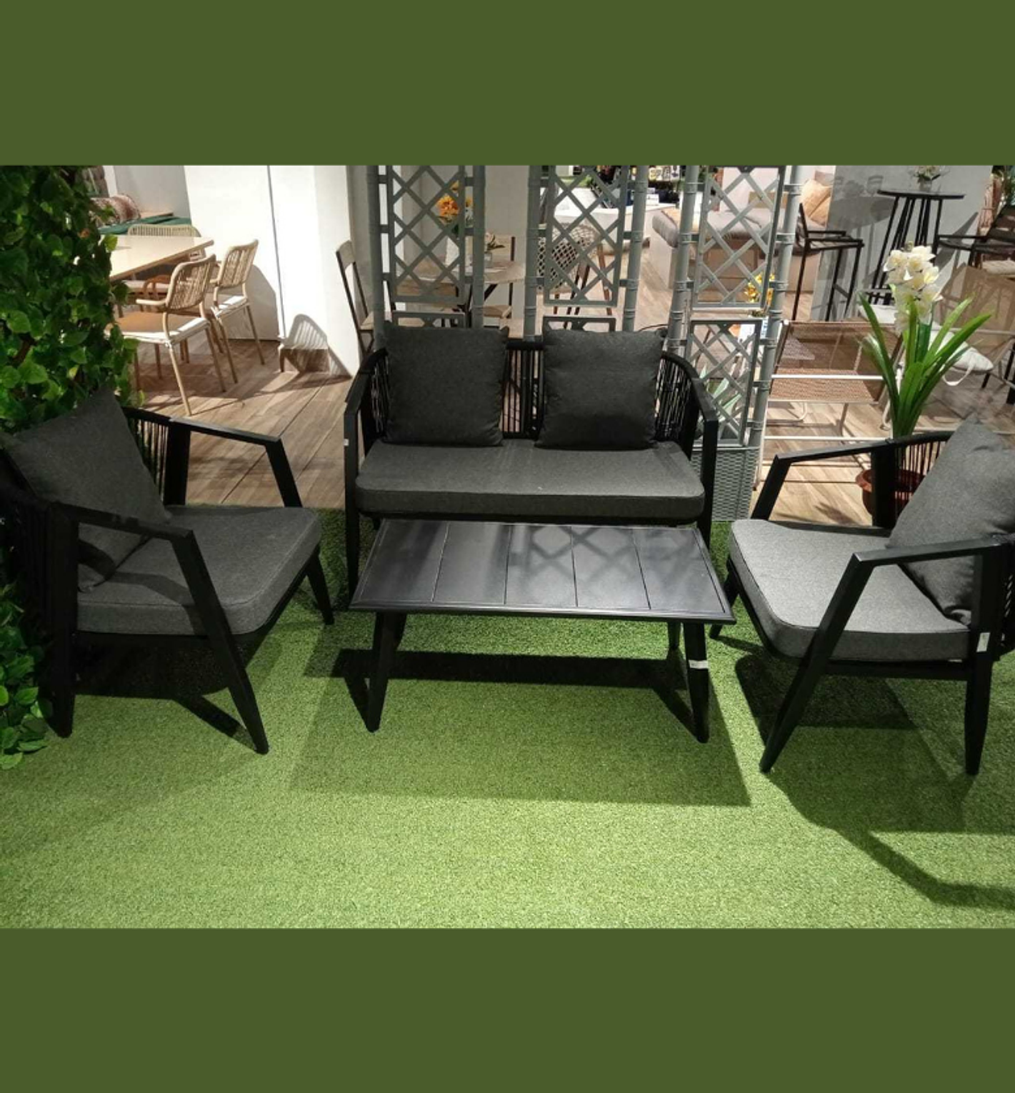 Sofa garden set 2+1+1+ kd steel coffee table + kd chairs pe rattan grey (bx1017c) fabric cushion 8 cm + 4 back cushions + black steel #ref:rs118 + rd118 123*66# 1cl#