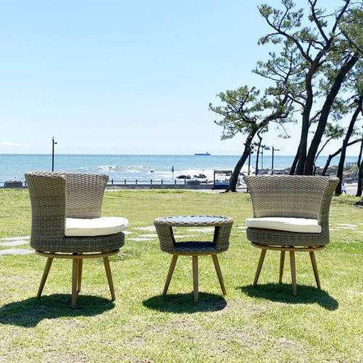 A compact and stylish 3-piece outdoor bistro set featuring two comfortable chairs and a matching table. Designed with beige cushions for cozy and elegant outdoor relaxation.