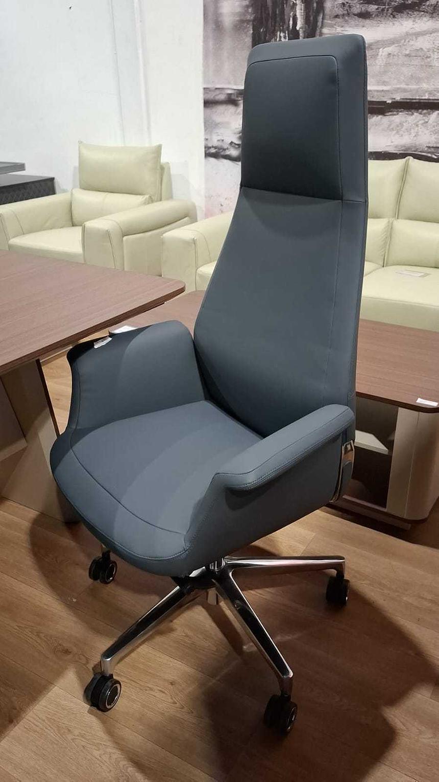 The Regal Height Executive Swivel Chair is a statement piece crafted for leaders, combining high-grade materials with an ergonomic form. Upholstered in a refined dark blue PU leather, the material offers a plush, professional appearance and maintains excellent durability for heavy use. The chair is distinguished by its extra-tall backrest and subtly curved armrests, which provide continuous support up to the neck and shoulders. Underpinning the design is a sleek, polished aluminum base, providing a solid, stable foundation that contrasts beautifully with the deep blue upholstery. Complete with a smooth swivel action and casters for easy mobility, this chair is an elegant, functional choice that significantly enhances the professional appeal of any modern office or conference area.