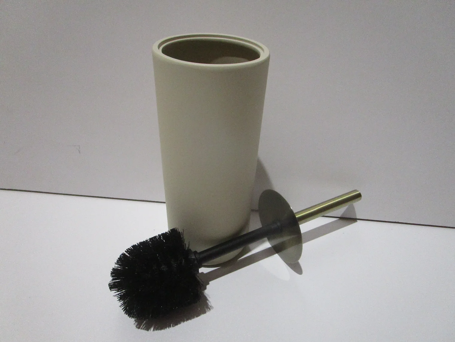 A stylish ivory-tone toilet brush and holder set in a “duo” version designed for bathroom accessory use.