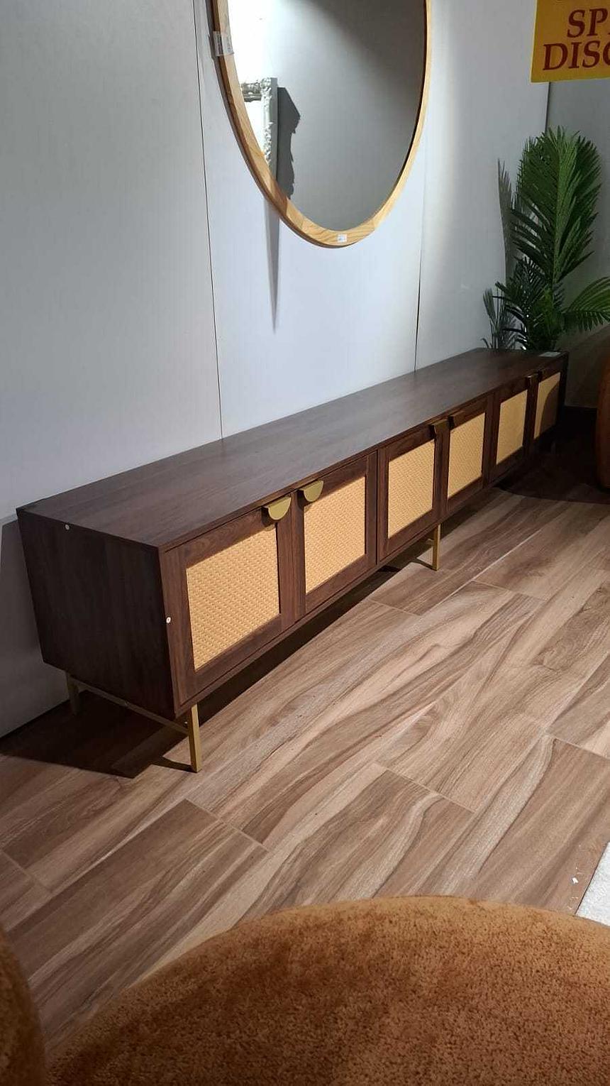 This impressive media console combines rich walnut-wood surfaces with natural canage (woven rattan) panels, elegantly accented by antique bronze handles and legs. With generous dimensions of 240 cm width × 40 cm depth × 52 cm height, it offers substantial space for your television, media components, and display décor—while ensuring a low-profile height for comfortable viewing. The walnut tone brings warmth and depth; the natural canage adds texture and lightness; and the bronze hardware grounds the design with a refined metallic touch. Designed for modern or transitional interiors where material quality and finish matter, this piece harmonises style and functionality—ideal for those who appreciate elevated finishes and thoughtful design.