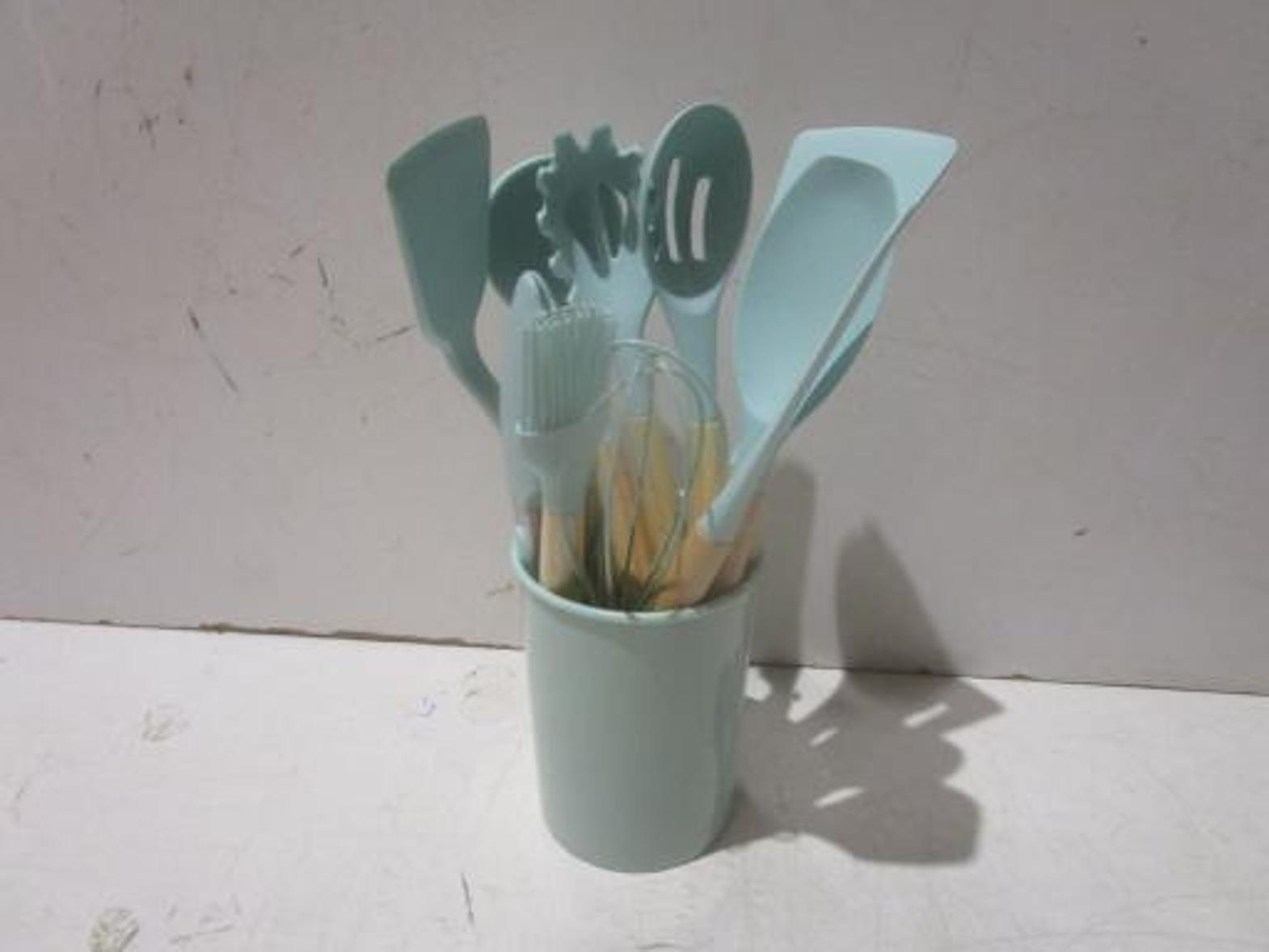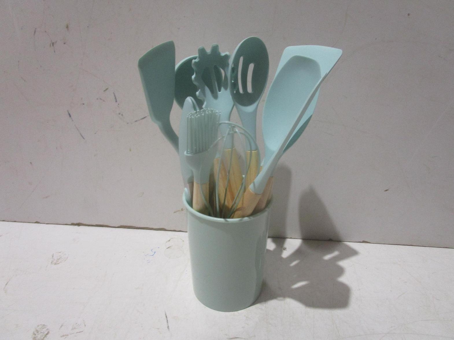 Utensils kitchen silikone x11 + bamboo wood handle + x1 plastic cup holder 706g tempreture : 30c-230c cup:14.5*9.5cm 114g soup spoon: 32cm 67g whisk: 24cm 28g scraper: 32cm 65cm skimmer : 32cm 60g noodle spoon: 32cm 46g oil brus #ref:7-36245-1-a# 16ac#
